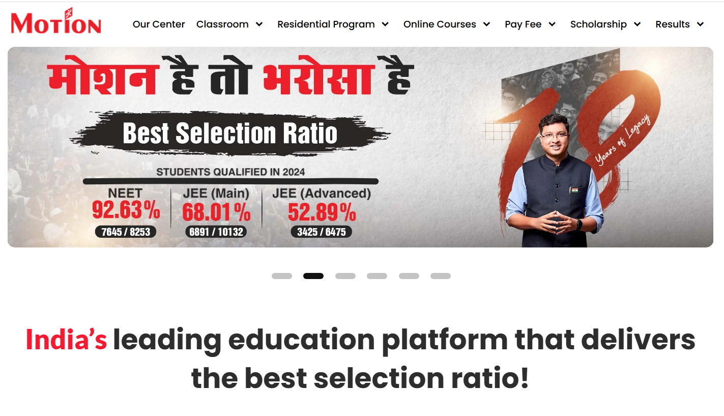 Motion Kota is the best coaching institute in Kota, Rajasthan. The journey of imparting education to Motion began in 2007. In the initial phase, the institute provides educational aid only for the JEE. Later, batches for NEET and other Olympiad preparations. The institute provides classroom and online batches, along with the support of the Motion Learning App. Since its inception, the institute has managed to bag top ranks, including positions in the top 50 every year. Hence, Motion Kota became the best coaching institute in Kota for JEE & NEET. Students are provided with both academic and non-academic support from the faculty and staff members here. The institute has 4 divisions in Kota for JEE, NEET, and Foundation Courses, including the Day-Boarding, School Integrated, and Evening Programs.